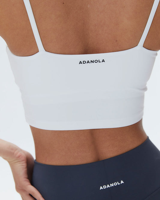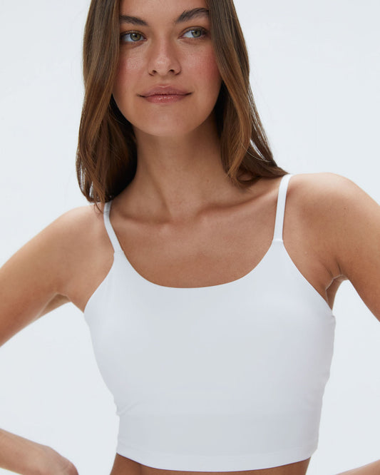 Lightweight and comfortable, the Tank Bra offers the perfect mix of comfort and style. With a long body, skinny straps and high neckline, this bra is perfect for medium support workouts. This bra comes with removable padding. Styled with a puffer jacket for the colder season.