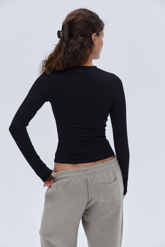 Soft Basics have landed. Introducing our new form-fitting Cotton stretch Long Sleeve Top. Made from soft Cotton fabric. This Top features a tonal back-neck logo embroidery. Wear yours with Cotton pants or tailoring for an effortless look.