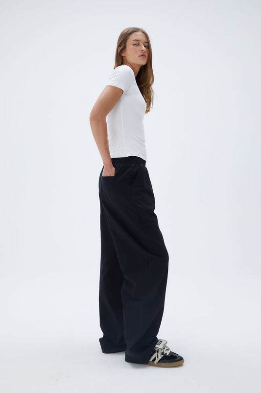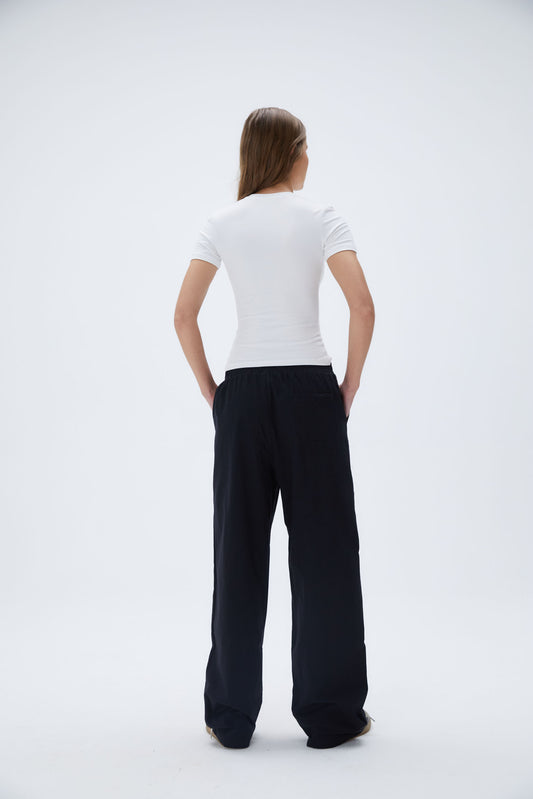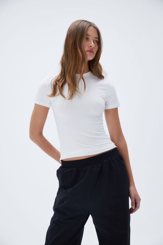 Soft Basics have landed. Introducing our new form-fitting Cotton stretch Short Sleeve Top. Made from soft Cotton fabric. This Top features a tonal back-neck logo embroidery.  Wear yours with Yoga Pants or tailoring for an effortless look.